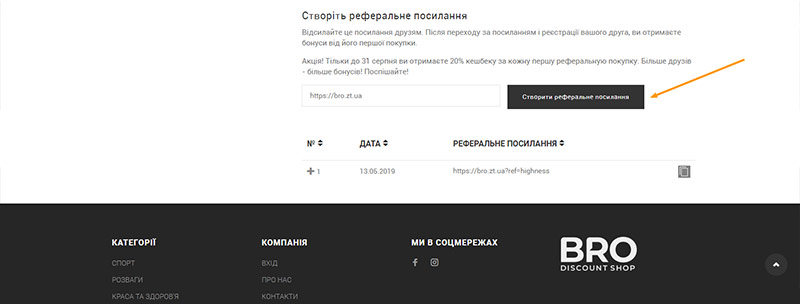 На BRO з’явилась можливість отримувати кешбек від покупок друзів. 10% від суми першої покупки друга буде нарахована на ваш особистий рахунок і ви зможете використати її на покупки в інтернет-магазині. Для цього потрібно лише створити своє реферальне посилання.